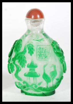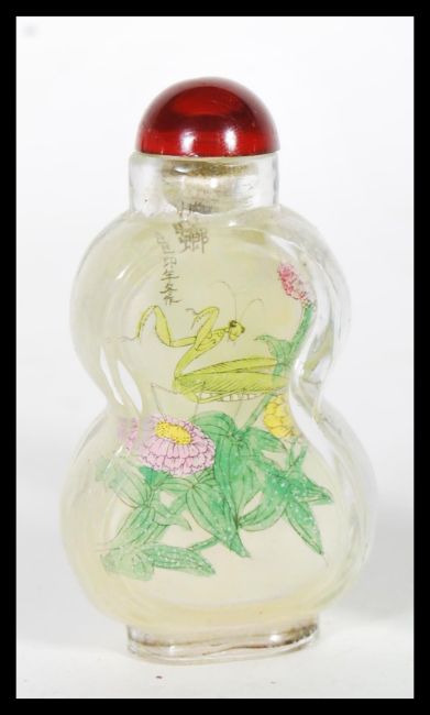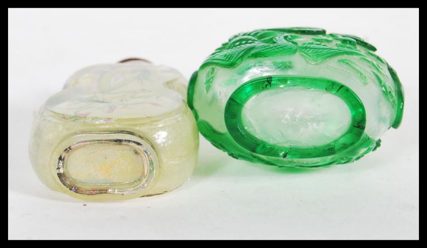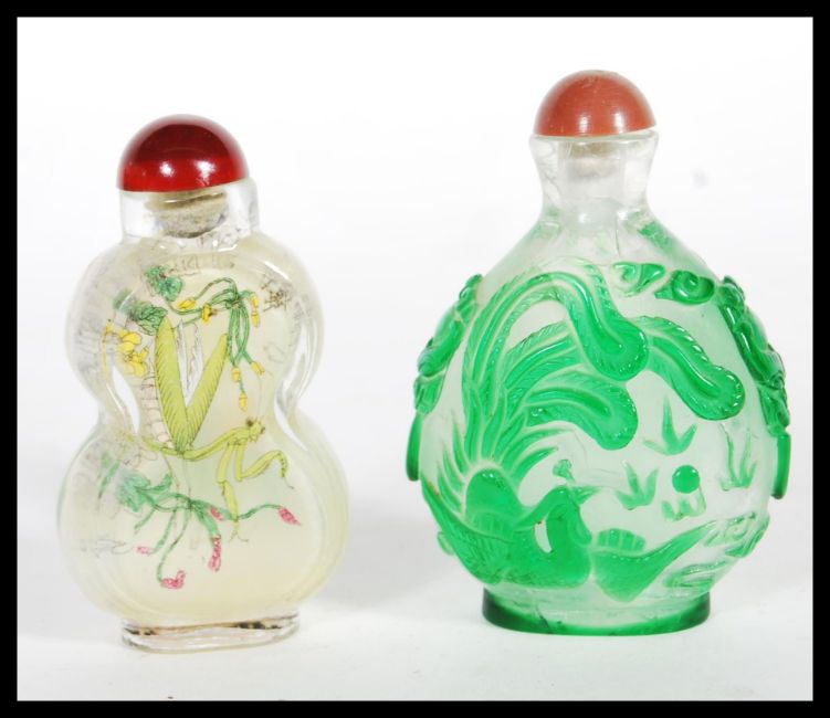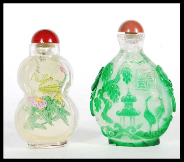 Two 20th century Chinese glass snuff bottles both with stoppers, the first having had painted grasshopper, flower and Chinese characters and the second carved in relief.Measures 7cm high.