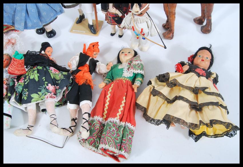 A collection of vintage mid 20th Century world dolls dressed in traditional costumes to include an Arabian doll riding a leather camel, a Swiss doll, a Florentine doll, a Maltese bride, Scottish Highland doll etc.