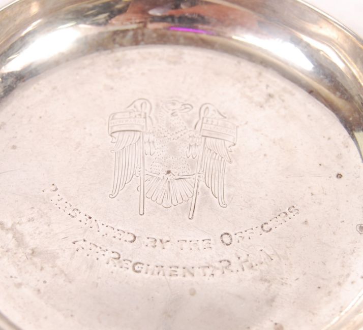 A collection of x3 hallmarked silver military related pin dishes. All being engraved for the Royal Horse Artillery, 4th Regiment (hallmarks for London, Gibson & Co - all circa 1950's)/ 170g total weight. Interesting collection.