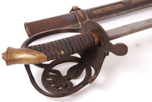 An unusual 19th century believed French Cavalry Officer's sword / sabre. Cast basket guard, with brass end cap and copper wire decorated handle. Knight's motif to blade with indistinct markings. Within its original steel scabbard. Measures approx; 97cm long in total.