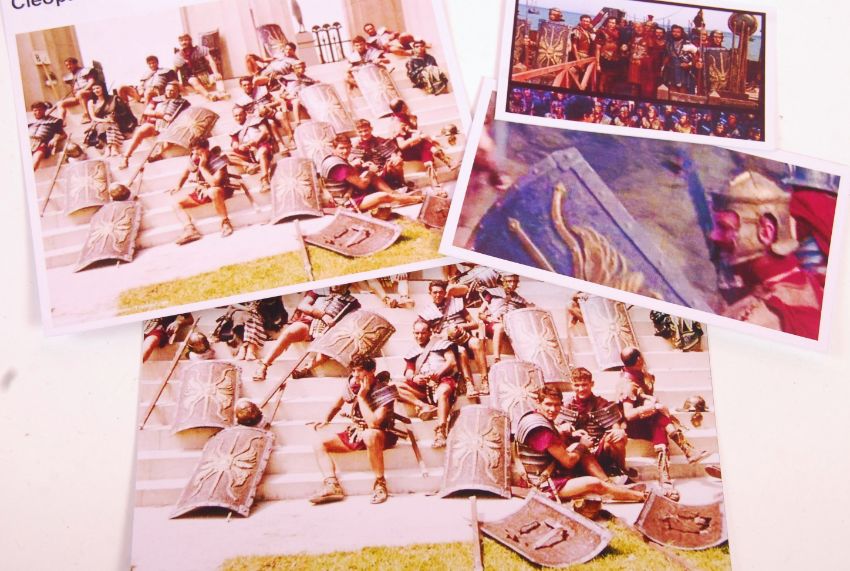 Carry On Cleo (1964 comedy starring Sid James, Kenneth Connor, and Amanda Barrie) - original production used prop Roman shield. Fibreglass construction, with a decorative motif to front. Leather handles fitted to verso. This shield, and others like it, can be seen at various points during the movie. Some production related wear and tear, but generally very good condition. A rare Carry On prop. Measures: H103cm x W59cm.