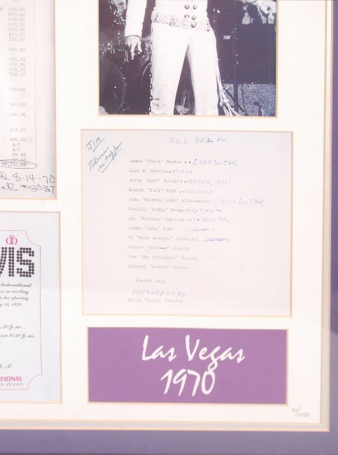 An Elvis Presley Enterprises official Limited Edition (90/1000) ' Las Vegas 1970 ' memorabilia presentation. Featuring various items of reproduction memorabilia to include; a sketch of Elvis' famous jumpsuit, Band credits, receipt for Elvis' costume and other items. Framed and glazed to a total size of: 63cm x 89cm. Certificate to back.