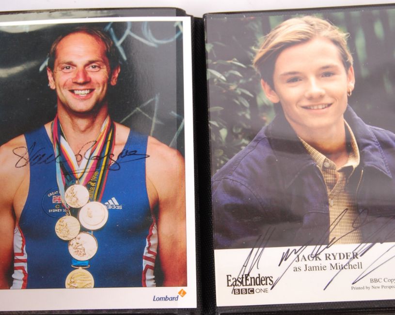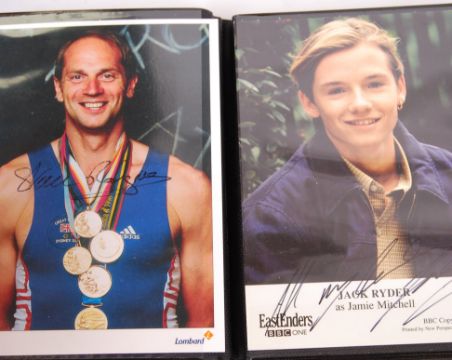 A collection of assorted autographs - largely British TV personalities and actors, but also some sport and music related included. Comprising: Athony McCoy, Barnes & Don, Glen Murphy, The Patton Brothers (known later for their involvement with The Chuckle Brothers), Jim Watt, Betty Driver, Bill Treacher, Richard Dunwoody, Glen Campbell, Mike Berry, Paul Nicholas, Lulu, Sir John Mills, Jean Boht, Noel Edmunds, Barbara Knox, Jean Alexander, Stephanie Cole, Wendy Richard, Bradley Walsh, Elizabeth Dawn, Yoko Ono ' A Piece Of Sky ' postcard, Paddy Ashdown, Nick Faldo, Glenda Jackson, Cliff Richard, Gary Barlow, Frank Bruno, Steve Redgrave, East Enders cast cards, Phil Collins, Brian Conley, Michael Palin, Thora Hird, Bob Monkhouse, Rolf Harris, Lee Evans, James Stewart, Peter Falk, Joe Brown, Seb Coe, John Simpson, Johnny Briggs, Kim Wilde, and many others. Various signed pictures, letters and other items.  Quantity of loose and x2 albums present.