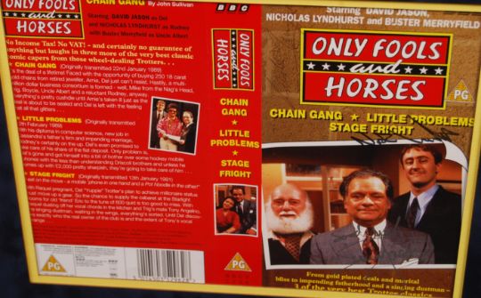 Only Fools & Horses - a rare and iconic piece of costume from the series - Del Boy / Derek Trotter's original gold bracelet, as worn by David Jason throughout the series. The gold plated chainlink bracelet features a central engraved bar ' Del Boy '. The bracelet has been professionally mounted, framed and glazed alongside a cast signed VHS Video cover (autographed by David Jason, Nicholas Lyndhurst and the late Buster Merryfield) and a photograph of the trio. A fantastic display piece. Del Boy was known for wearing lots of jewellery, and this prop is an important part of the character. Measures approx; 46cm x 63cm. With certificate of authenticity from Famous Memorabilia (AFTAL).