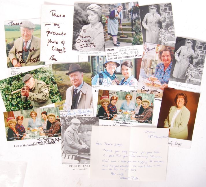 A collection of hand signed photographs all relating to actors / actresses from the sitcom Last Of The Summer Wine. Largely official castcards. Autographs include; Frank Thornton, Peter Sallis, Brian Wilde, Jane Freeman, Stephen Lewis, Robert Fyfe, Kathy Staff and others. Some letters / envelopes included. x15 items.