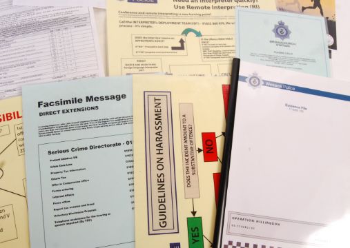 Broadchurch: A great collection of original props & set dressing items from ITV's ' Broadchurch ' starring David Tennant & Olivia Coleman. Largely appearing to be from the final series, the props include; a large fold-out map, x5 ' Visit Broadchurch ' pamphlets, various ' Wessex Police ' posters, an ' Operation Hillindon ' Wessex Police file with various maps and photographs included, a call sheet dated 28th September 2016, and a copy of page from David Tennant's shooting script, and other items. Interesting collection