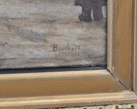 Paul Louis Bouchard ( French 1853 - 1937 ) A street scene view towards the Kremlin, Moscow, Russia 1895. Oil on canvas painting being signed to the corner and dated. Set within stunning believed original florentine carved cushion gilt wood frame. The painting having been retained within the private vendors family since the 1920's. Frame measures 86cms x 69cms ) Canvas 56cms x 39cms ( measured from the rear )