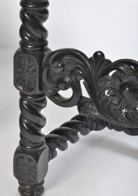 A pair of 19th century George III / Carolean revival ebonised oak throne chairs. Likely of Portuguese origins to ownership, these stunning chairs with barley twist legs and stretchers, profusely carved front apron beneath upholstered seat and centre back rests. The chairs elbow rests terminating in carved figural dragon masks, the back rests with barley twist columns and pierced carved detailed surrounds to the upholstered centres. Carved crown top rails, the barley twist columns terminating in finials to each side. The chairs having one blue and one red upholstered centres with Portuguese coats of arms and latin inscriptions. Measures 149cms high x 69cms wide x 78cms depth