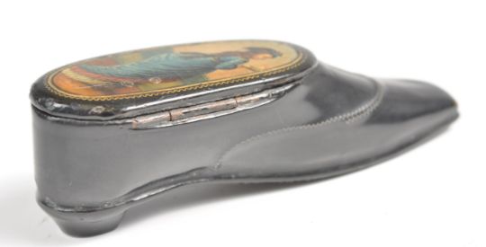 An early 19th Century Georgian paper mache snuff box / vesta case in the form of a shoe or boot having painted portrait panel to lid depicting a lady in blue dress. Measures 8cm long.