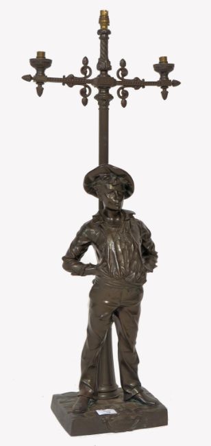 A 19th Century Victorian spelter bronze effect table lamp entitled 'Siffleur' modelled as a whistling young man standing with hands on hips in front of a lamp post raised on naturalistic base. Signed Millard. Measures 85cm.