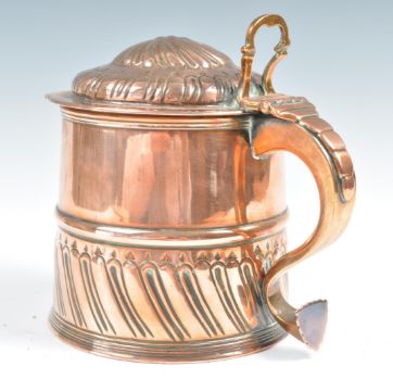 A 19th Century copper lidded mug or tankard having repousse decoration. The cylindrical body being half reeded with shaped S scroll handle having floral medallion lid. Measures 14cm high.