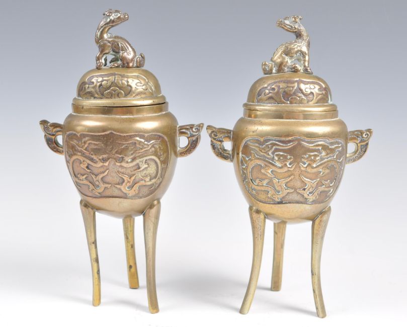A pair of 19th Century Chinese bronze censer ding prayer bowls / incense burners raised on tall tripod legs having relief decoration depicting dragons with shaped scrolled handles and Dog of Fo finial lids. Measures 18cm high.