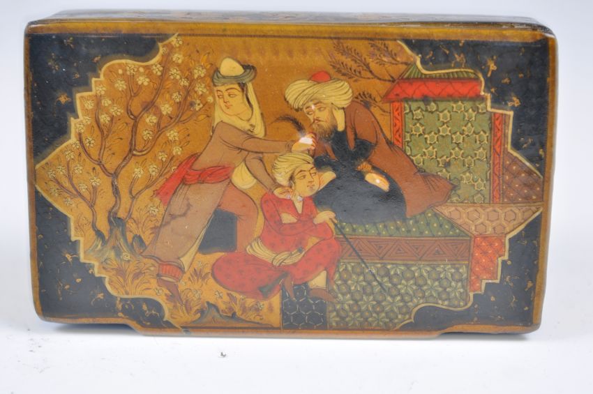 A 19th Century Qajar lacquer papier mache snuff box of rectangular form having hinged lid decorated with three gentleman. The sides decorated with birds amongst foliage. Measures 9cm wide.