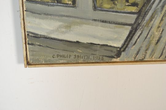 Philip Smith (1928-2018) A 20th Century book binding artist - A mid 20th Century oil on canvas painting depicting a nude female standing at a window and gazing at the viewer, gesturing to the garden outside. Painted in greys scale with small planes of colour and visible brushstrokes, the hair being highlighted with yellow tones. Signed C Philip Smith 1958 to the lower left corner and framed. Measures 93cm x 103cm.