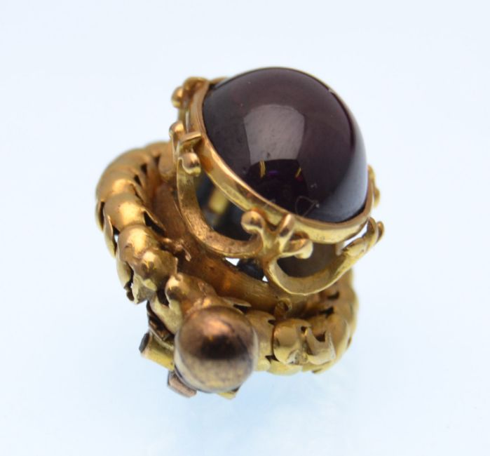 An 18ct gold mid Victorian garnet cabochon brooch. The garnet being collet set within a Brazilian snake link mount. Total weight approx 4.5g.  Measures approx 1 inch.