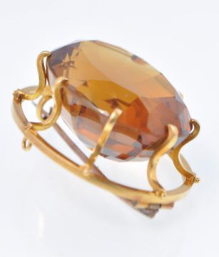 A large Victorian facet cut citrine and gold brooch. The citrine in 8 prong setting with open work frame, pin verso and pendant bale. Weight 20.7g