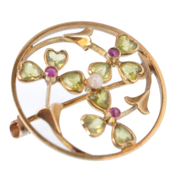 An early 20th century yellow 15ct gold and peridot, pearl and ruby Art Nouveau roundel brooch. The stones in floral openwork vine and leaf mount setting with pin verso. Hallmarked 15ct / MG. Size 1" Approx  / Weight 3.46G
