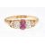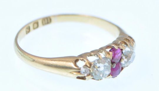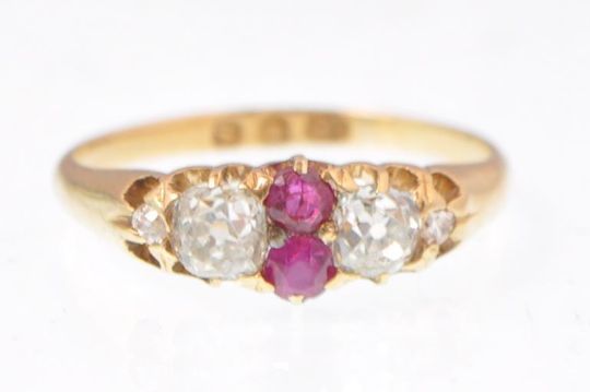 A Victorian hallmarked 18ct gold ruby and diamond ring dated 1893 London. The ring having 2 old cut European diamonds of approximately 0.34ct each with 2 central rubies 3mm each. Size M / Weight 2.3g