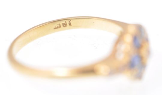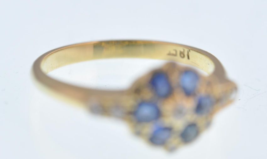 An 18ct gold sapphire and diamond ring. The ring being set with 6 cornflower blue oval cut sapphires surrounding a central old cut diamond with rose cut diamond spacers and old cut diamond accent shoulders. Sapphires approx 3.5mm x 2.5mm x 1.4mm Weight 3.5g. Size P.5.