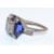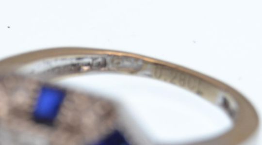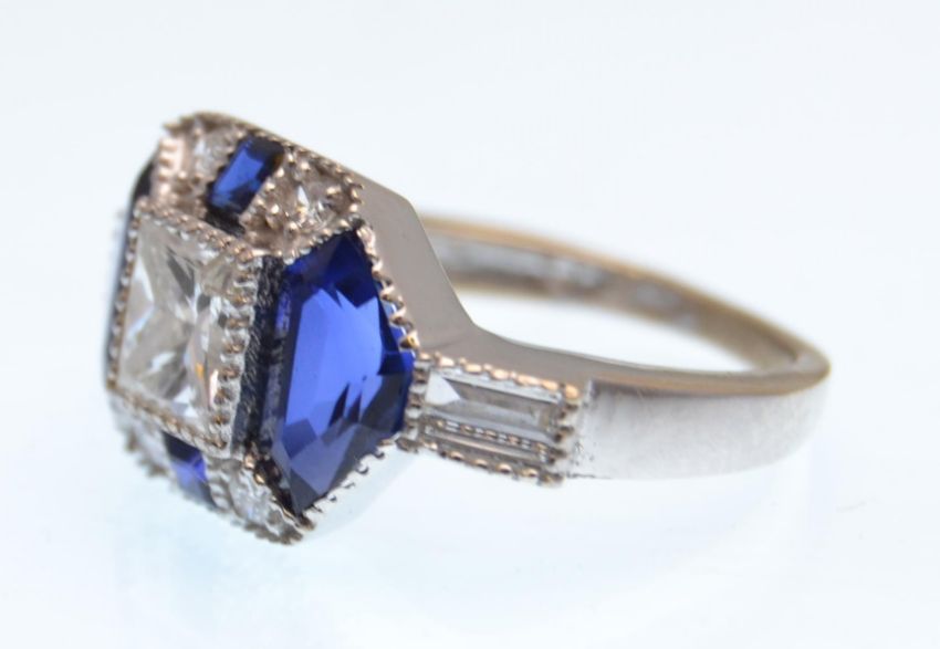 An 18ct white gold diamond and sapphire Art Deco style ring having a central princess cut diamond of approx 50pts with baguette diamond shoulders. The central stone flanked by two large fancy cut sapphires with square cut sapphires and brilliant cut diamonds surrounding. Weighs 5 grams size N.