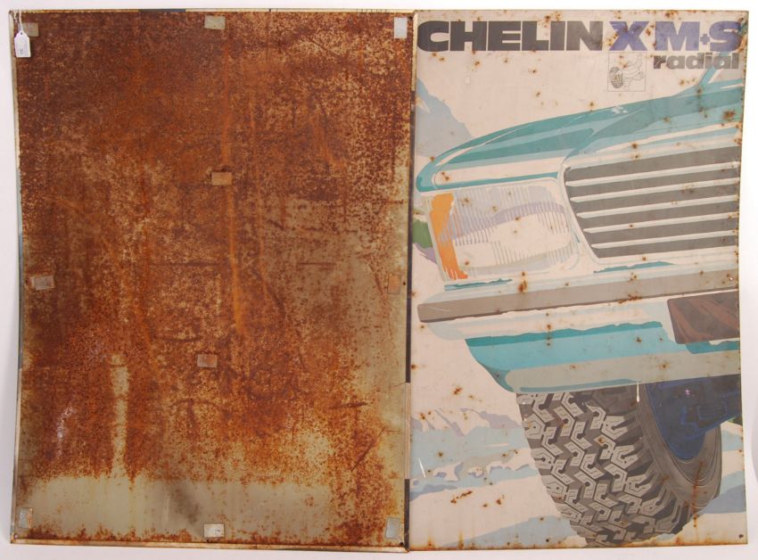 Michelin - Two original mid 20th century retro vintage point of sale advertising tin signs for XVS Radial and XM&S Radial tyres. Rectangular construction with original 8 colours. Measures; 80cm x 60cm.
