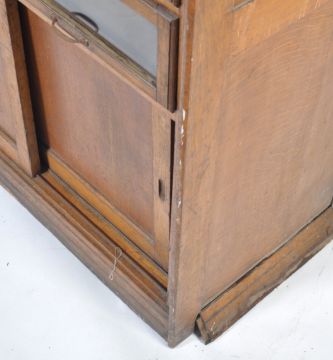A large mid 20th century retro vintage haberdashery point of sale shop display cabinet fitting raised on twin sliding wooden door plinth cupboard bases having 16 wooden and glass fronted drawers. Makers plaque to front reading 'Dudley & Co Showcase Manufacturers, Holloway, London. Measures; 198cm x 90cm x 50cm.