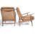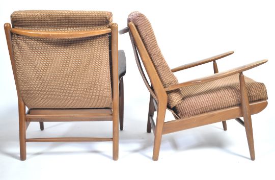 Scandart Ltd - A fantastic pair of low mid century easy armchairs in teak wood having a-frame angular form. The cushions being in a chequered woolen fabric and laid on a base of web strapping. The chairs having applied plaque for Scandart LTD. Measures 80cm x 56cm x 80cm