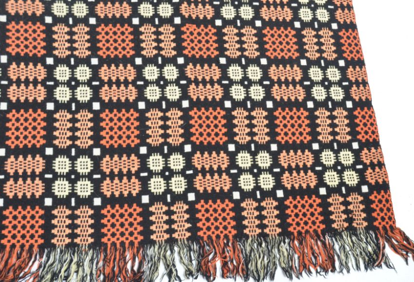 A mid 20th century retro vintage welsh blanket having geometric repeating patterns and tasselledfringe to two sides. The blanket having a black, orange and cream colourway. Measures 184cm x 210cm.