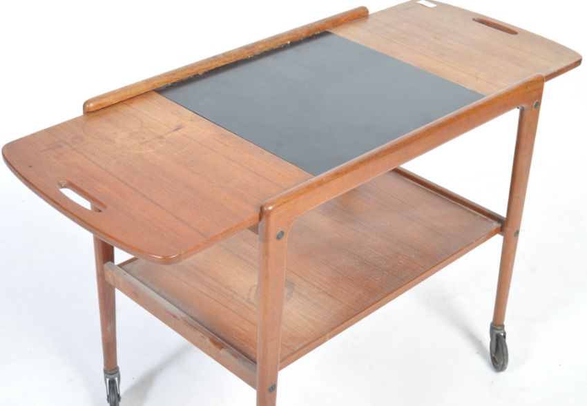 Yngve Ekström - Källemo - Thea - An original mid 20th century 1950's retro vintage two tier tea trolley having ebonised legs and raised on large casters. The legs being ebonised with the top tier having an ebonised central panel with drop leaf action and handles to the flanking panels. Stamped' Made in Sweden ' to underside. Measures 62cm x 42cm x 72cm.