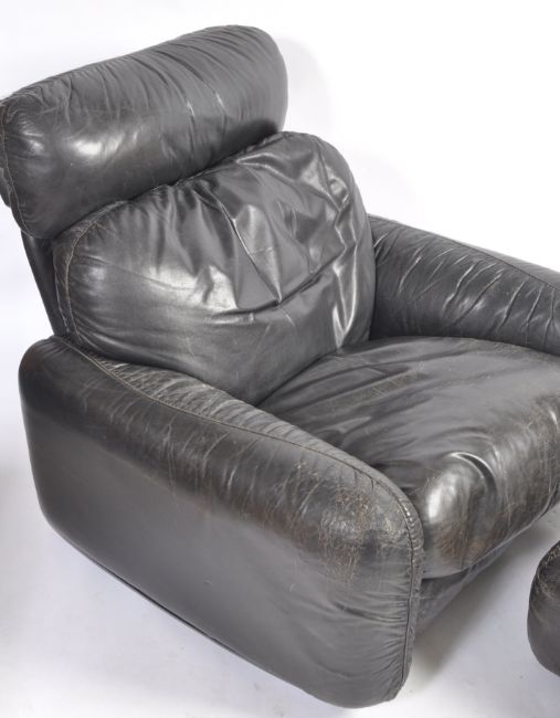 Aarigo Arrigonai - Busnelli Piumotto - A 1970's retro vintage easy / lounge chair / armchair having deep cushioned dark leather upholstered cushions and armrests. Makers mold marks to the black plastic base. Measures 86cm x 90cm x 90cm.