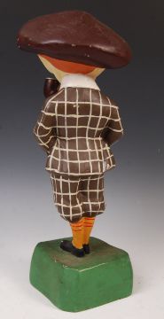 Penfold - A mid 20th century retro vintage shop advertising point of sale display figural stand of 'The Penfold Man' advertising golf balls. The figure having an oversized peaked cap wearing golfing attire raised on a square base with the slogan 'He Played A Penfold'. later added pipe. Measures; 51cm.