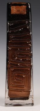 Geoffrey Baxter - Whitefriars - Totem - 9671 - A 1960's retro vintage studio art glass vase having a squared tapering shape and Greek key type textured decoration to front in a cinnamon colourway. Measures; 27cm.