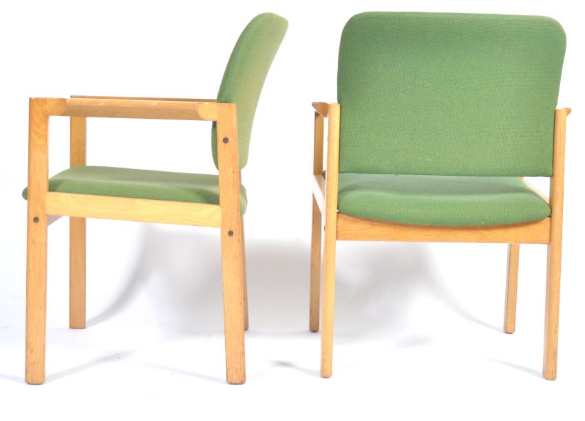 Bjerringbro Kontormøbler - A rare set of six 20th century retro vintage teak wood Danish dining chairs raised on cylindrical support having shaped ar, rests with mint green upholstered seat pads and backrests.
