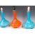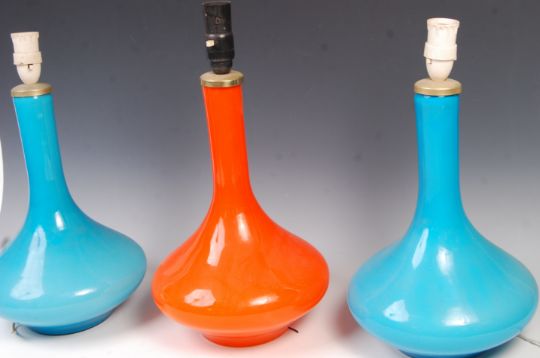 Holmegaard - A set of three 20th Century Scandinavian studio art glass lamp bases / table lamps having bulbous squat bodies with tapering cylindrical necks. Two in baby blue and one in tangerine orange having open base. Brass fittings to top. Measures: 46cm tall.