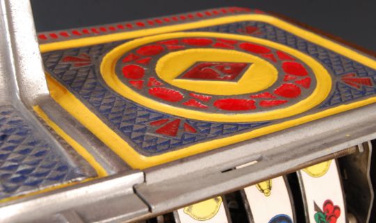 Jennings - Peacock - An early 20th Century rare original 1930's vintage one arm bandit fruit slot machine having oak case with cast metal relief decoration bearing peacocks in yellows, reds and blue. Jackpot window to front having pull arm to side. Patent number 1403933. O.D. Jennings and Co Bell Fruit Gum Chicago III to inner reel. Original mechanism and lock and key present. Working condition. Measures 62cm x 42cm x 40cm.