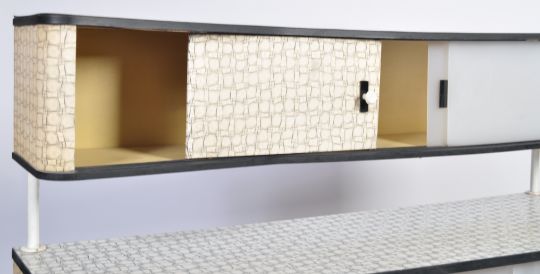 Raymond Loewy - Arvin Furniture - Modern Living - An original 1950's retro vintage american formica kitchen cupboard cabinet having a wire framed construction with a large bottom unit with cupboard perspex sliding door cupboards adjacent with a smaller top unit above. Makers plaque to inner door. Measures; 119cm x 122cm x 41cm.