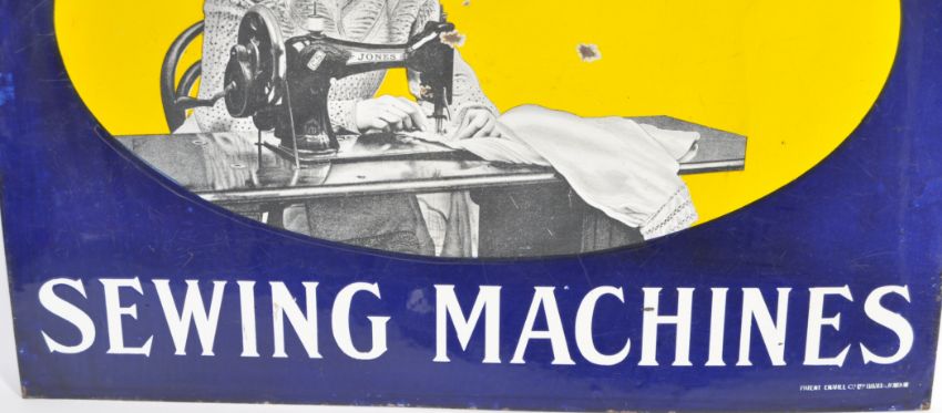 Jones Sewing Machines - An early 20th Century retro vintage advertising point of sale shop porcelain enamel sign for Jones Sewing with makers name to lower right corner Patent Enamel Co Ltd Birmingham and London. Central image on yellow ground depicting a lady using a sewing machine reading 'Busy'. Bold white text on cobalt blue enamel ground. Measures 81cm x 86cm.