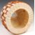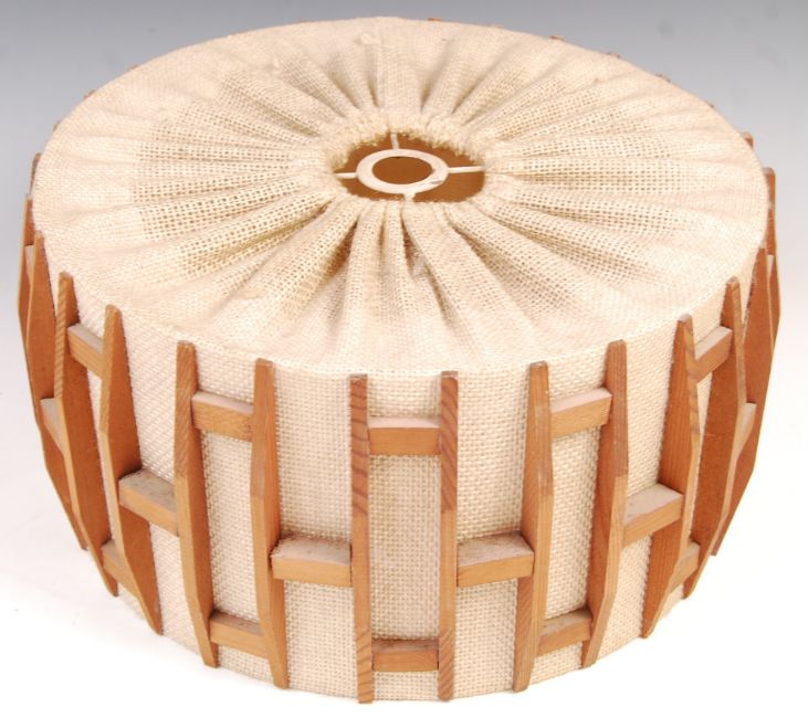 A 20th century retro vintage lamp light fixture shade having a hessian type fabric back with shaped teak wood panel border. Measures 37cm in diameter.