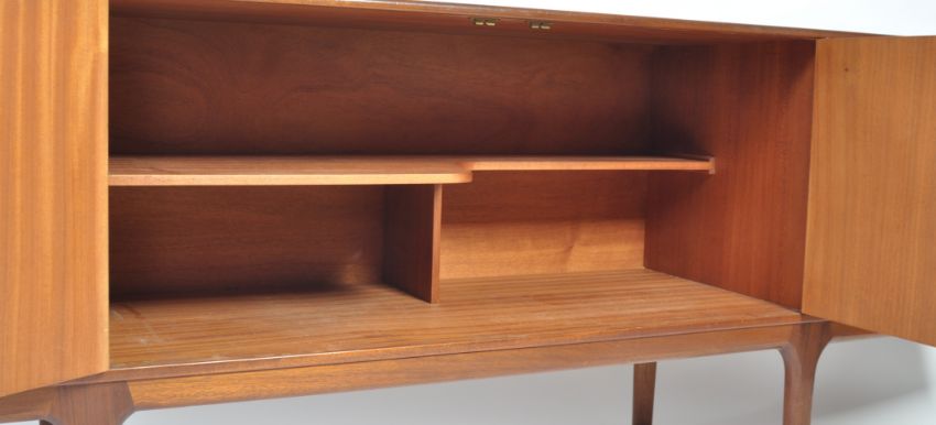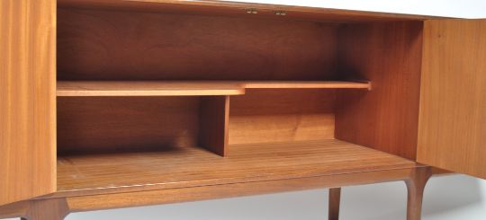 Tom Robertson - A.H. Mcintosh Of Kirkcaldy - Dunvegan Range - A 1960's retro vintage teak wood sideboard credenza unit having central twin cupboard with lipped handles flanker by pull out bar compartment and bank of three drawers with lipped handles. Raised on tapered supports. Makers label to inside of drawer. Measures 75cm x 214cm x 47cm.
