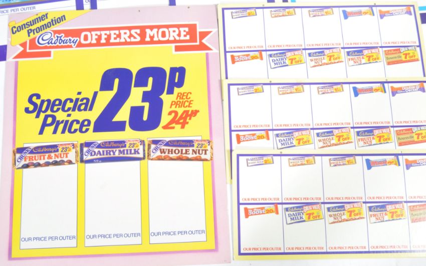 Cadburys - A collection of 20th Century retro vintage advertising point of sale sweet shop confectionery chocolate signs / price boards to include Dairy Milk, Fruit and Nut, Whole Nut, Milk Tray, Fudge, Picnic, Frys Chocolate Cream, Turkish Delight, Buttons, Double Decker, Caramel. Great artwork and notation present.