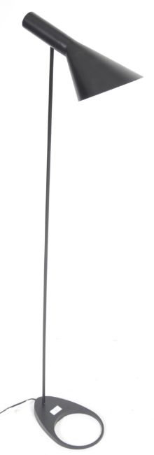 After Arne Jacobsen - A contemporary AJ type floor standing standard lamp. The lamp having an adjustable conical shaped shade on a straight support raised on a shaped base with large hole to foot all being finished with a black coating. Measures; 130cm tall