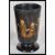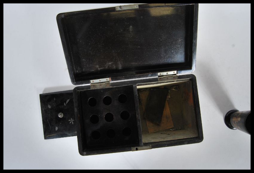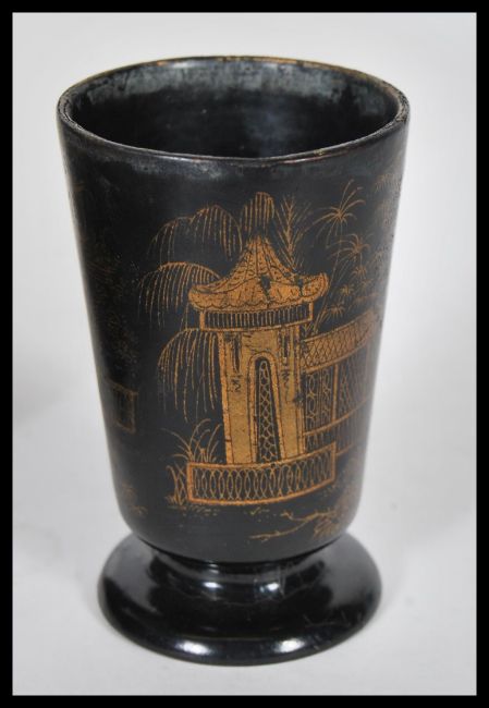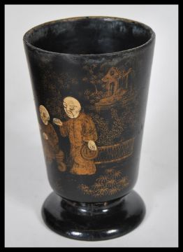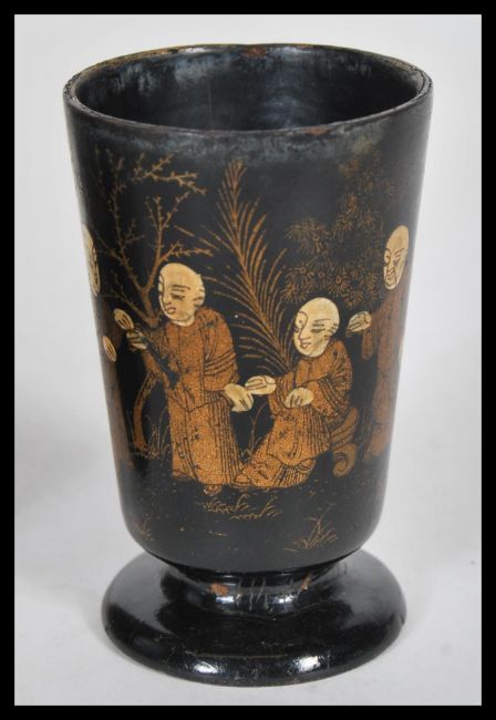 A early 20th Century Japanese lacquered tea caddy, having hand painted decoration atop depicting trees and floral scenes with two birds fighting. The hinged lid opening to reveal a fully appointed interior. Together with a small footed lacquered cup decorated with elders, finished in gilt.