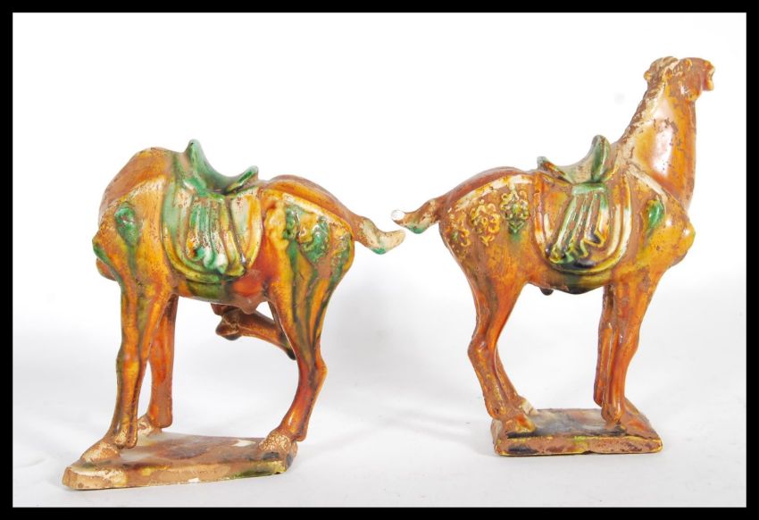 A pair of vintage 20th Century reproduction Chinese Tang dynasty ceramic War Horses. Having majolica style drip ware glaze. Impressed marks to base. Measures 15 cm high.