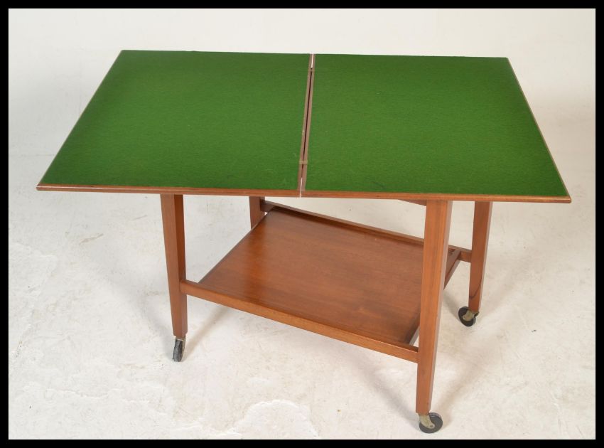 A vintage retro mid 20th Century teak wood tea trolly / card table having a two tiers with a hinged folding top revealing a felted playing table complete with hidden compartment of playing cards. Measures 82cm high x 65cm wide x 46cm depth