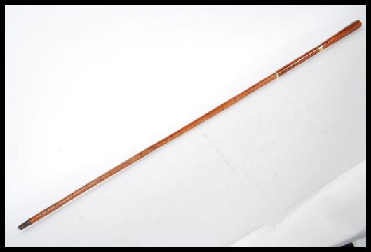 A 20th Century walking stick cane of tapering form, having gold coloured bands on a bamboo shaft, with brass ferrule. Measures 93cm long.Measures 93cm wide.