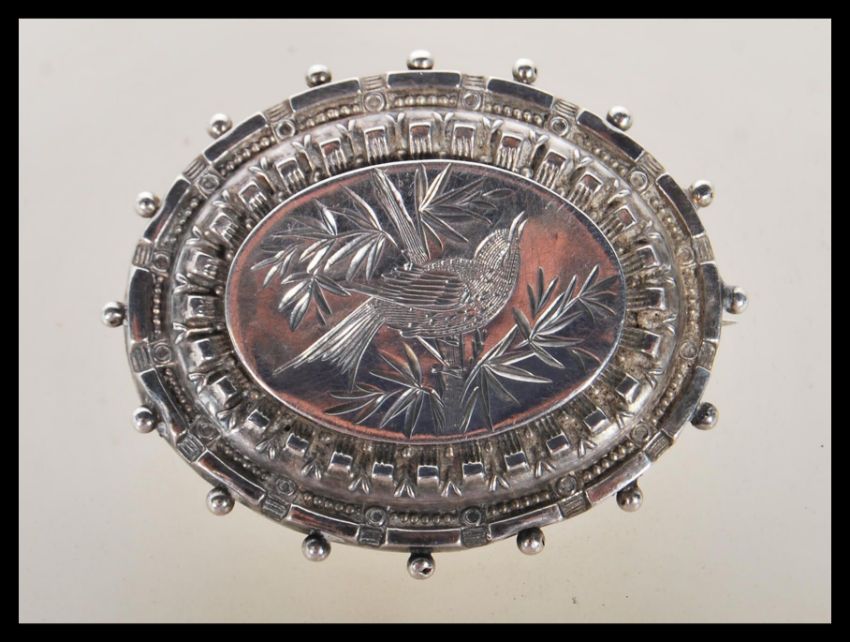 A pretty Victorian hallmarked silver sweetheart brooch, chase engraved to the front with a songbird within foliate border,  having a glass panel at rear with photo. Assay mark for Birmingham, dating to 1885 with makers marks for  Henry Wilkinson and Co. Weight 8g.Measures 4cm wide.
