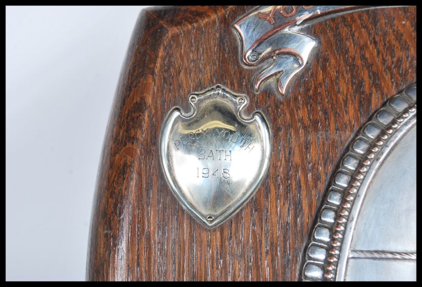 A early 20th Century armorial oak shield back boxing trophy, having large silver plate relief decorated central scene depicting two gentlemen boxing. Surrounded by small shield plaques starting from 1948 Pearcy youth bath 1948 and 1965, Bridgwater boys-club 1963, Yeovil A.B.C 1964 and 1966-67, Bristol and District A.B.C 1965-66. Presented by Frome youth football supporters club 1948.
