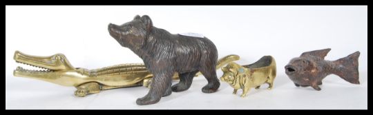 A selection of 20th Century cast metal animals to include a cast metal fish, a brass pin cushion in the form of a pig (cushion missing), a cast brass crocodile nutcracker and a bronzed cast metal figurine of a bear with its face raised.