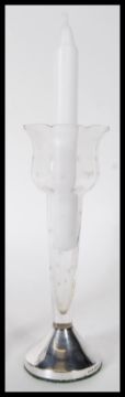 A pair of vintage glass candlestick holders of octagonal form with bell shaped sconces being etched with starburst motifs raised on silver hallmarked bases (Hallmarked London 1902) together with a silver hallmarked candle snuffer having repousse floral decoration (stamped with S date letter 1892, Birmingham ) on a turned wooden handle.Measures 19cm high.