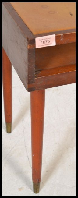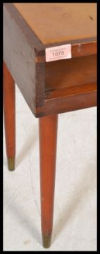 A vintage retro 20th Century teak wood telephone table raised on tapering legs with brass feet. Measures 50 cm high x 73 cm wide x 37 cm deep.